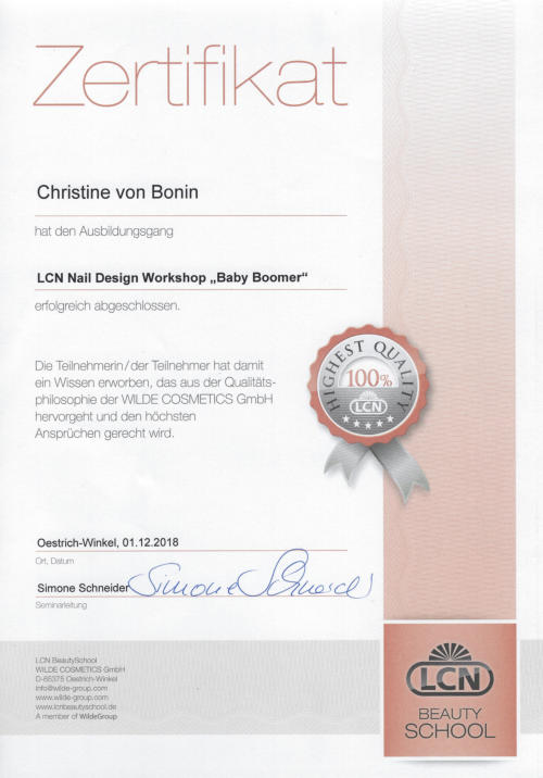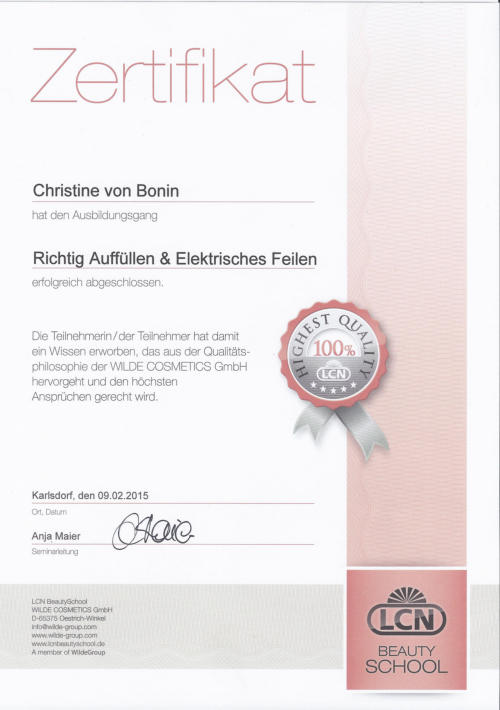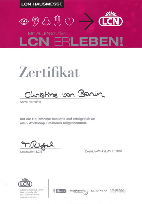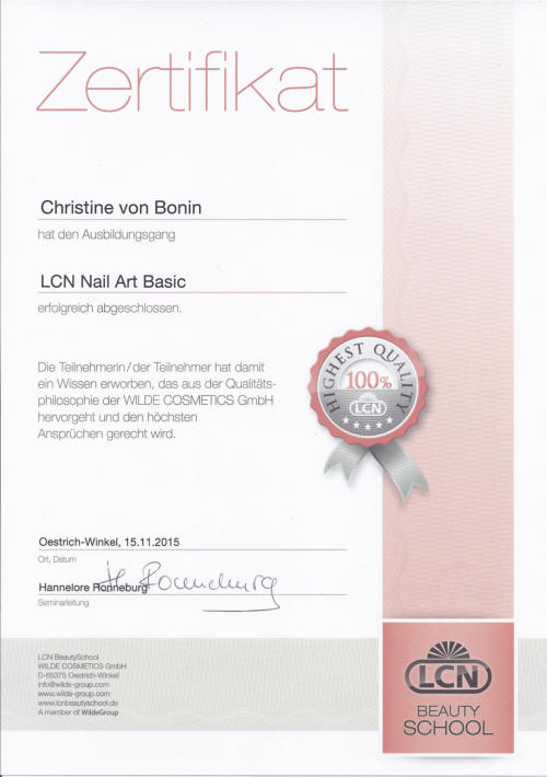 Ich arbeite mit den neuesten Methoden und bin auf dem aktuellsten wissenschaftlichen Stand. Immer bemüht für Sie den neusten Trend zu kennen, besuche ich mehrmals jährlich Workshops, (Produkt-) Schulungen und Fachmessen. Ich verarbeite ausschließlich professionelle Produkte aus dem Hause LCN.Warum LCN?Der Erfolg von LCN basiert auf einer kompromisslosen Ausrichtung auf Qualität, Verträglichkeit und Anwenderfreundlichkeit. LCN bietet höchste Bioverträglichkeit. Die Produkte sind säurefrei bzw. säurearm. Der Naturnagel wird geschont. Die Gesundheit des Nail Designers und der Kundin wird nicht beeinträchtigt.LCN-Produkte sind aufwendig getestet (selbstverständlich ohne Tierversuche) und erfüllen alle Anforderungen der deutschen sowie europäischen Gesetzgebung für Kosmetika und werden in Deutschland produziert.Mit über 120 verschiedenen Schellacken und über 100 verschiedenen Farbgelen finden Sie für jeden Anlass die passende Farbe für Ihre Fingernägel!